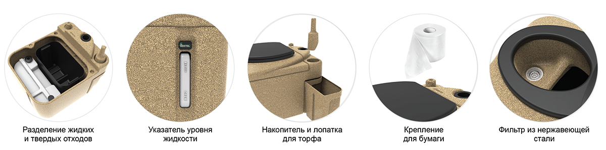 Туалет оснащён держателем для туалетной бумаги, который фиксирует рулон и свободно вращается вместе с ним. Диаметр вентиляционных труб составляет 50 мм, отверстие в корпусе закрыто герметичной манжетой. Требуется приобрести только трубу нужной длины, в зависимости от места установки.